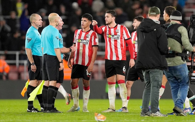 Các cầu thủ Southampton phản đối trọng tài vì cho rằng Quansah đã phạm lỗi trong vòng cấm