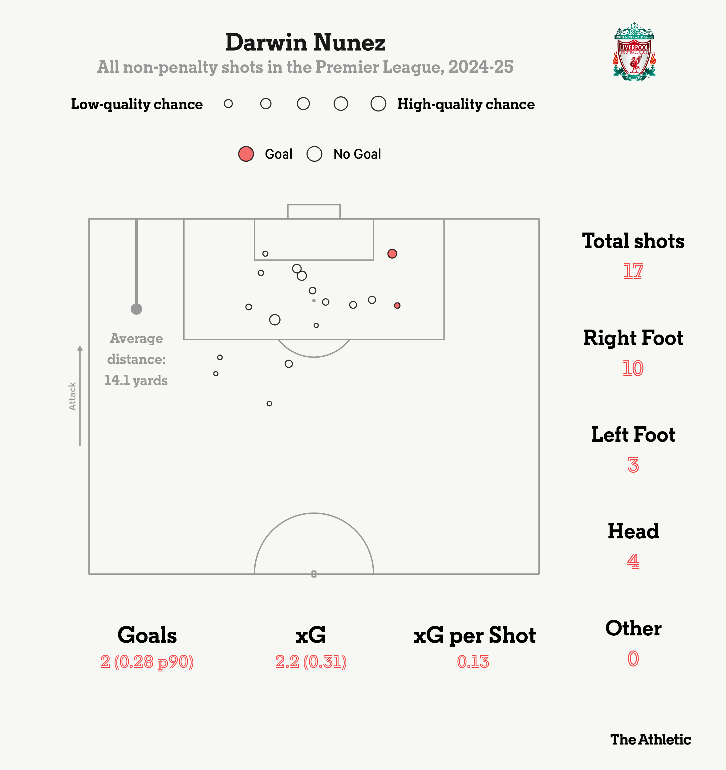 Bản đồ các pha dứt điểm của Nunez thì phân tán hơn nhiều, với nhiều cú sút được thực hiện từ xa hơn và ở những góc kém thuận lợi hơn — do đó, tổng số bàn thắng kỳ vọng (xG) của anh là 2 so với 3 của Jota.