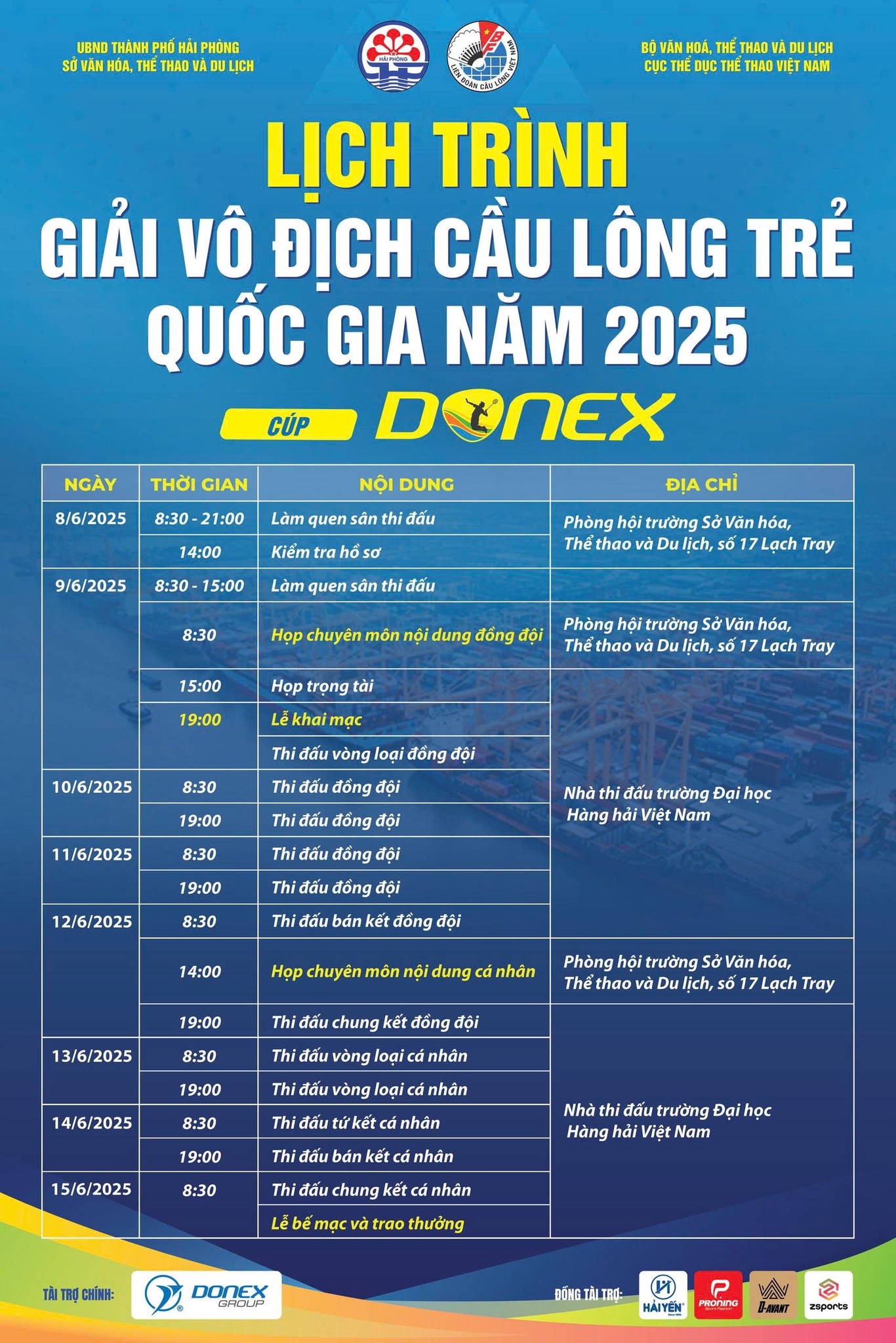 Giải vô địch cầu lông trẻ quốc gia năm 2025 – Cup Donex diễn ra tại Nhà thi đấu Trường Đại học Hàng Hải Việt Nam – TP Hải Phòng từ ngày 9/6-15/62025. Giải đấu năm nay trở lại với quy mô hoành tráng, quy tụ gần 200 VĐV trẻ xuất sắc đến từ 22 đơn vị tỉnh, thành, ngành trên khắp cả nước. BTC hứa hẹn mang đến một sân chơi chuyên nghiệp, công bằng và tràn đầy tinh thần thể thao cao thượng.