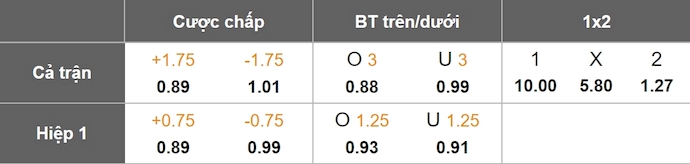 Kèo châu Âu hiện cũng ddang ở mức rất chênh lệch. Kèo cho đội chủ nhà thắng lên tới 10.00 trong khi kèo cho hai đội hòa cũng đang là 5.80 thì kèo cho đội khách thắng chỉ ở mức 1.27