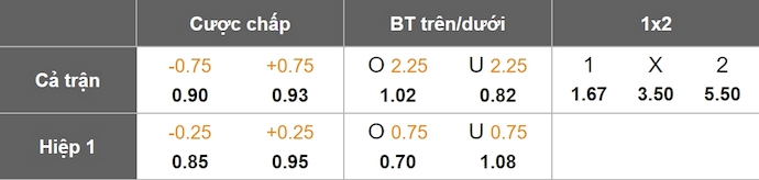 Kèo châu Âu cũng đang ở mức khá chênh lệch. Kèo cho đội chủ nhà thắng chỉ ở mức 1.67 trong khi kèo cho hai đội hòa là 3.50 còn kèo cho đội khách thắng lên tới 5.50