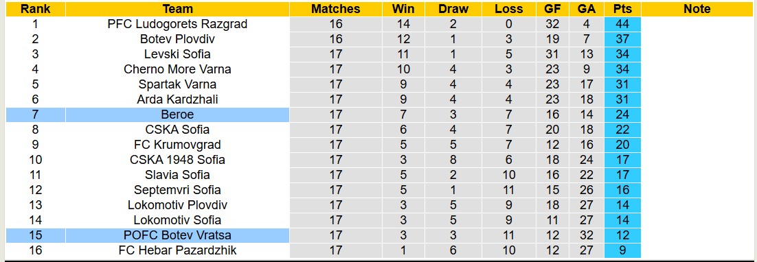 Thống kê phong độ, lịch sử đối đầu của Beroe với Botev Vratsa