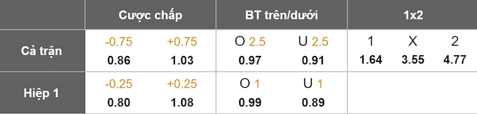 Kèo châu hiện đang ở mức khá chênh lệch. Kèo cho đội chủ nhà thắng chỉ ở mức 1.64 trong khi kèo cho hai đội hòa là 3.55 còn kèo cho đội khách thắng là 4.77