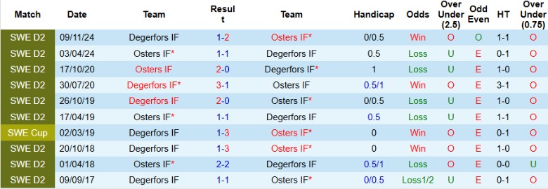 Về thành tích đối đầu trực tiếp, trong 10 lần chạm mặt gần nhất giữa hai đội trên mọi đấu trường từ năm 2017 đến 2024, Degerfors đang lép vế hơn đôi chút khi chỉ giành được 2 chiến thắng, hòa 4 và thua 4 trận trước Osters.