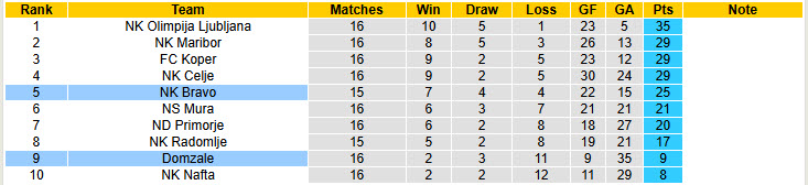 Domzale đứng ở vị trí thứ 9 trong số 10 đội tham dự với 9 điểm sau 16 trận. NK Bravo đứng ở vị trí thứ 5 với 25 điểm sau 15 trận.