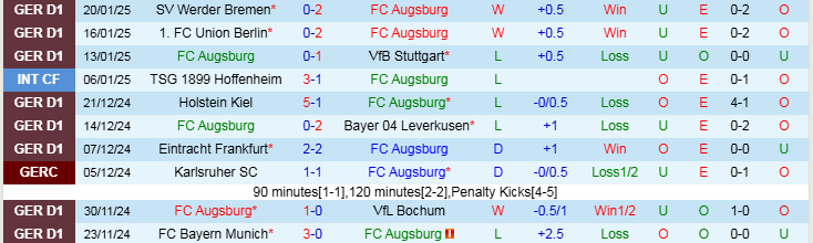 FC Augsburg đang là những người nắm lợi thế về thành tích đối đầu. Khi mà theo thống kê cho thấy, sau 5 lần chạm trán gần nhất giữa hai đội, họ đã giành được tới 4 chiến thắng.