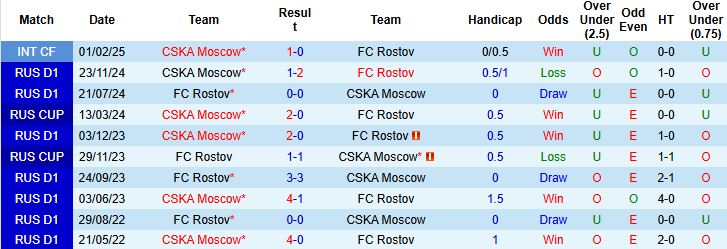 Sự vượt trội của CSKA Moscow còn được thể hiện qua những lần chạm trán. Theo đó, 13 lần đụng độ gần dây, Rostov chỉ duy nhất 1 lần được hưởng niềm vui chiến thắng, hòa 4 và nhận tới 6 thất bại. Lần gần nhất 2 đội gặp nhau tại cúp QG Nga, CSKA Moscow vượt qua Rostov 2-0 và trận chung kết siêu cúp Nga gần nhất 2 đội chạm trán, phần thắng cũng thuộc về CSKA với tỷ số 3-1.