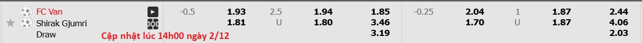 Dự đoán tỷ lệ bóng đá, soi kèo FC Van đấu với Shirak SC