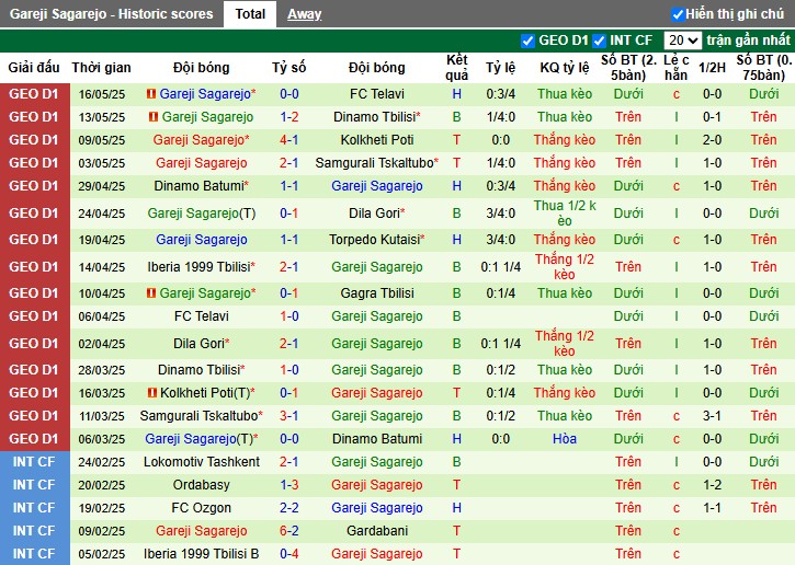 4 kèo gần nhất trên sân nhà, Gagra Tbilisi đã phải nhận tới 3 lần thất bại. Đối với Gareji Sagarejo, họ lại thắng ở 3 kèo gần nhất trên sân khách. Chọn Gareji Sagarejo.