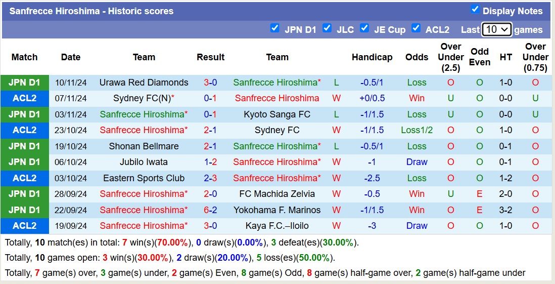 -Thống kê phong độ 10 trận đấu gần hai của Sanfrecce Hiroshima