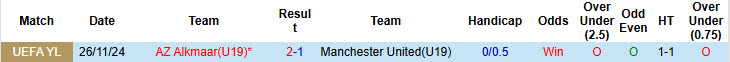 Man United(U19) thua kèo 3 trong số 4 trận đấu mới đây có cược chấp.  AZ Alkmaar(U19) vừa có mạch 7 trận đấu bất bại kèo và là lựa chọn an toàn.