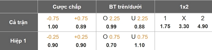 Kèo châu Âu hiện đang ở mức khá chênh lệch. Kèo cho đội chủ nhà thắng chỉ đang là 1.85 trong khi kèo cho hai đội hòa là 3.45 còn kèo cho đội khách thắng lên tới 4.25