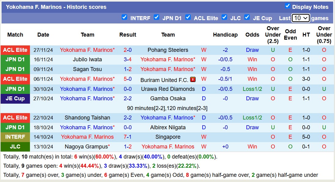 -Thống kê phong độ  10 trận đấu gần hai của Yokohama Marinos