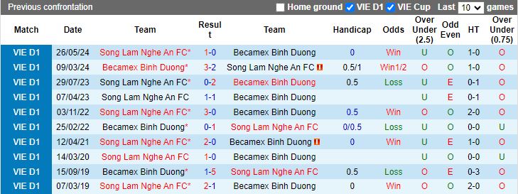 Trong 10 lần hai đội gặp nhau gần nhất, SLNA chơi tốt hơn hẳn khi thắng tới 7, hòa 1 và thua 2 trước Bình Dương.