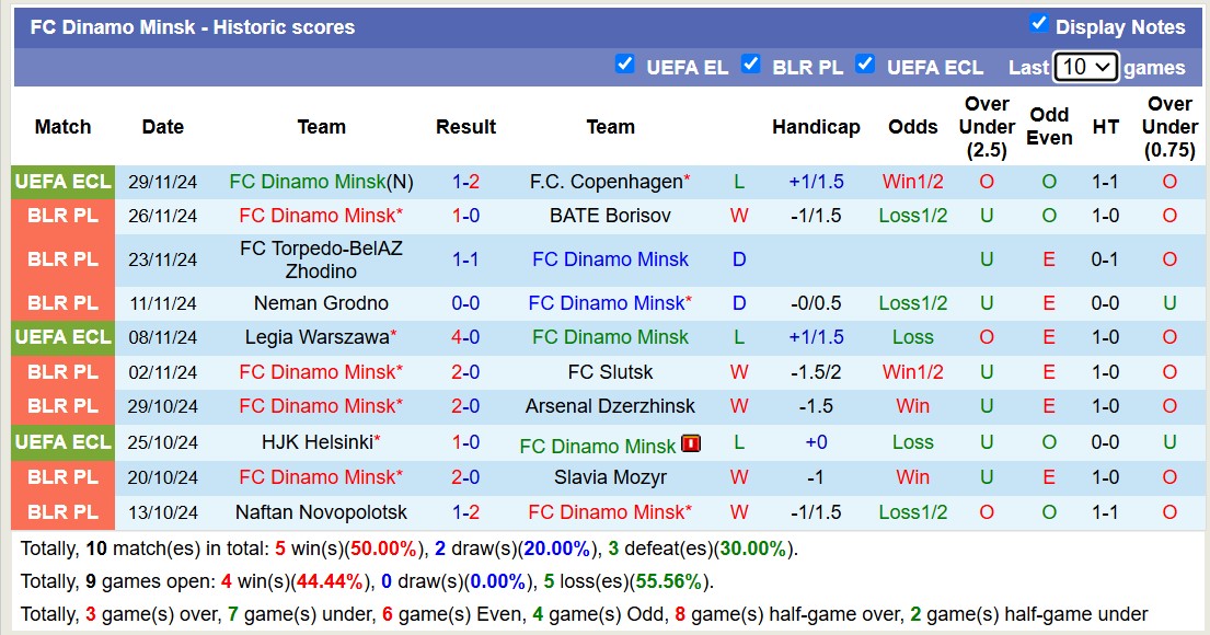 -Thống kê phong độ 10 trận đấu gần hai của Dinamo Minsk