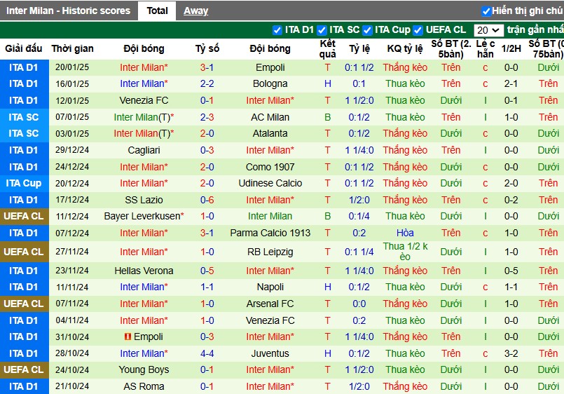 + Soi tỷ lệ kèo châu Á (1 1/4:0): 6 kèo handicap gần nhất của đội chủ nhà, họ chỉ thắng đúng 1 lần. Còn với Inter Milan, họ vừa mới có chiến thắng ở kèo handicap gần nhất. Chọn Inter Milan.