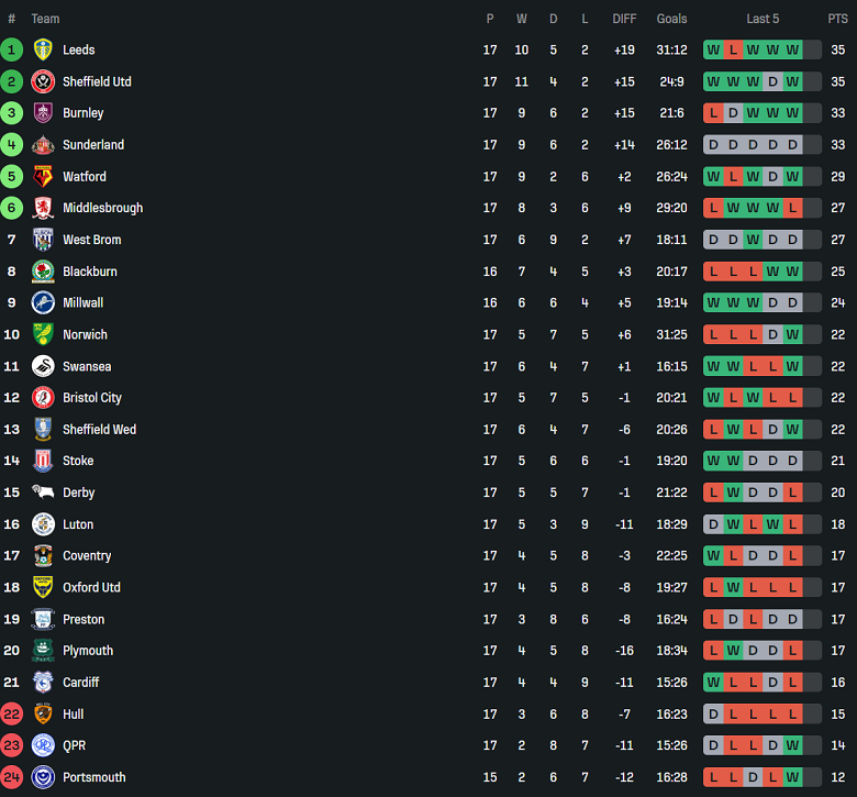 Trận Stoke City vs Burnley thuộc vòng 18 giải Championship 2024/25. Sau vòng 17, Stoke City giành được ít hơn Burnley 12 điểm: 21 so với 33. Với 33 điểm, Burnley thuộc nhóm 3 đội dẫn đầu bảng xếp hạng (tính đến trước vòng 18).