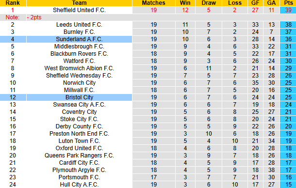Trong khi đó với số trận tương ứng, Bristol City giành 25 điểm, xếp ở vị trí thứ 12. Thế nhưng ở chuyến làm khách sắp tới, Bristol City vẫn tự tin vào khả năng có điểm. Trên sân khách Bristol City đạt phong độ tốt.