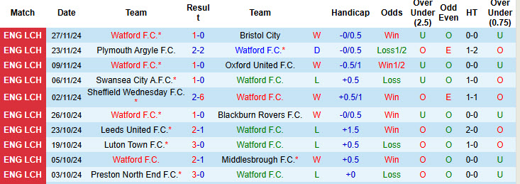 Thống kê phong độ 10 trận đấu gần nhất của Watford