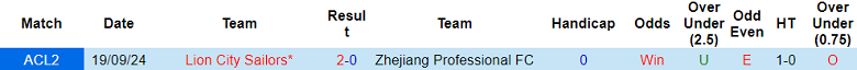 Zhejiang thua kèo tới 3/4 trận kể từ khi vòng bảng AFC Champions League Two 2024/25 khởi tranh, bao gồm cả 1 thất bại khi chấp đội khách nửa trái. Lion City Sailors thắng kèo 3/4 trận kể từ khi bảng F AFC Champions League Two mùa hiện tại chính thức diễn ra.