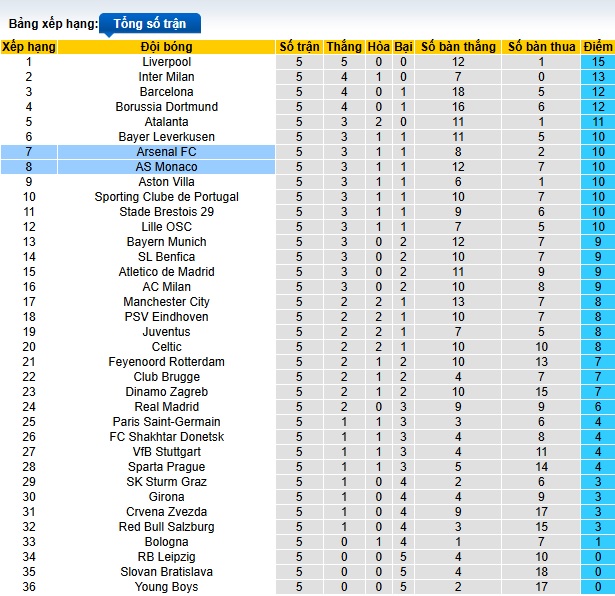 Arsenal đang đứng thứ 7 trên bảng xếp hạng với 10 điểm sau 5 trận đấu tại vòng phân hạng Champions League, thành tích này cũng giống hệt đối thủ Monaco, đội xếp dưới họ một bậc do kém về hiệu số bàn thắng bại.