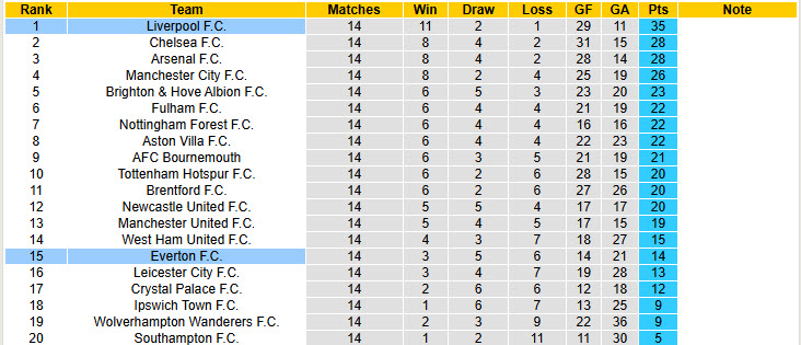 Everton đứng ở vị trí thứ 15 trong số 20 đội tham dự với 14 điểm sau 14 trận. Liverpool đứng ở vị trí đầu bảng với 35 điểm sau 14 trận.