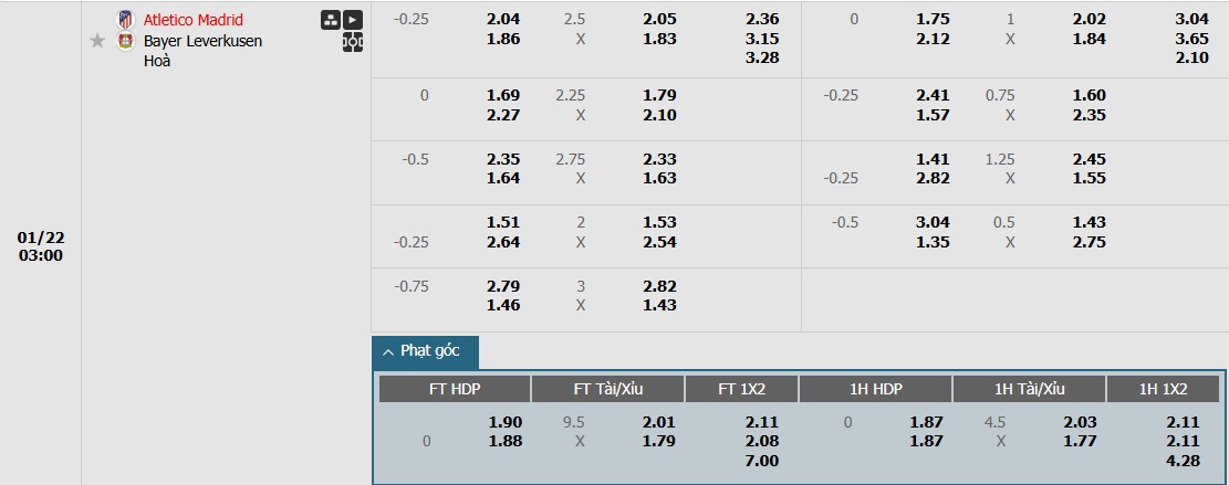 Ở kèo phạt góc cả trận, lựa chọn cửa cược Bayer Leverkusen vẫn sẽ là lựa chọn đáng tin cậy dành cho bet thủ. Nên nhớ rằng, 7/8 trận ra quân gần nhất của đội bóng này trên mọi đấu trường, họ đã thắng góc tới 7 lần. Với Atl Madrid, thống kê góc những trận gần đây của đội bóng này cũng không hề tệ. Dù vậy, trận thua muối mặt trước Leganes gần nhất chắc chắn sẽ khiến thầy trò Diego Simeone chịu nhiều áp lực.