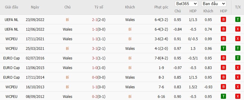 Ở kèo góc FT, Bỉ tiếp tục là những người được đánh giá cao hơn và chấp đối thủ 3.5 góc. Nhìn vào thống kê góc những trận ra quân gần đây của họ, điều này cũng là khá dễ hiểu. Thống kê chỉ ra rằng, Bỉ đã thắng góc ở 3 trận gần nhất của mình. Bên kia chiến tuyến, Wales đang tỏ ra lép vế hơn.