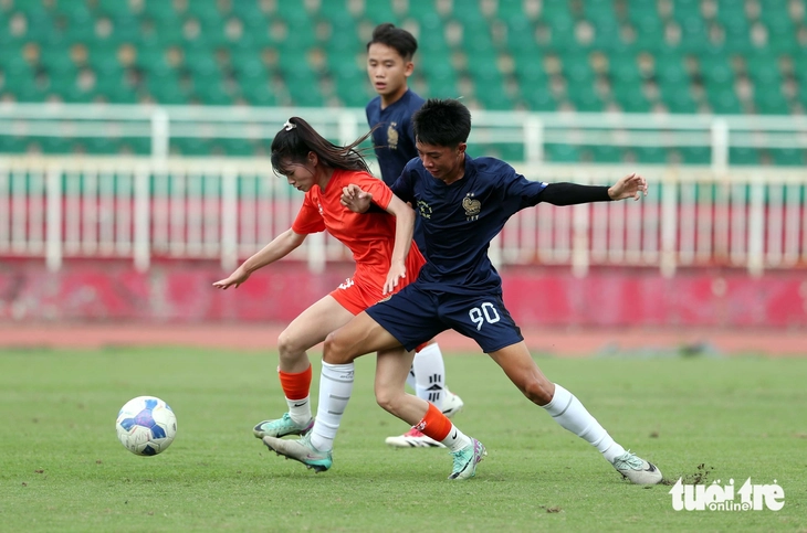 Họ tranh chấp mạnh mẽ, và tự tin chơi bóng trước các cầu thủ nam cao to hơn – Ảnh: N.K.